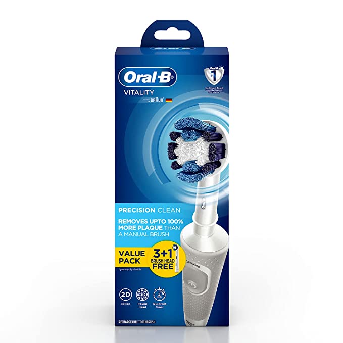Vitality from Oral B #1 brand recommended by dentists worldwide. This brush helps you helps you brush like your dentist recommends for 2 minutes with the professional timer. While you are moving the brush around your mouth, the Cross Action toothbrush head surrounds each tooth with bristles angled at 16 degrees, and 2D cleaning action oscillates and rotates for better plaque removal than a regular manual toothbrush Compatible with the following Oral-B toothbrush heads: CrossAction, 3D White, Sensi UltraThin, Sensitive Clean, Precision Clean, FlossAction, TriZone, Dual Clean, Power Tip, Ortho Care